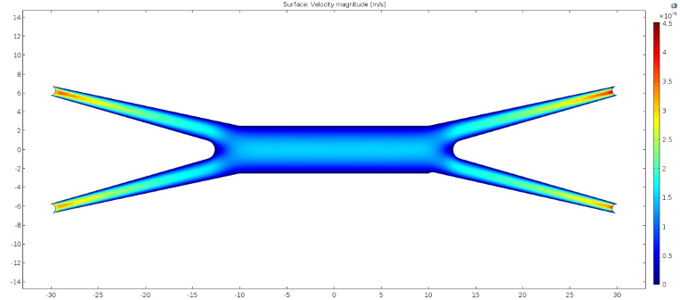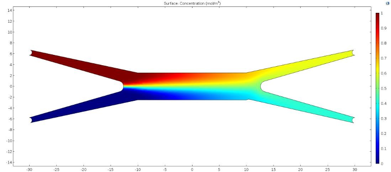 Physics interfaces used: laminar flow, transport of diluted species, flow coupling multiphysics interface.