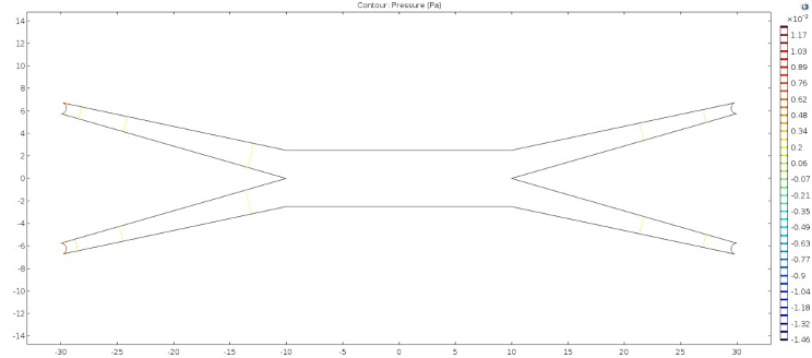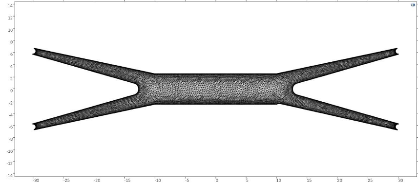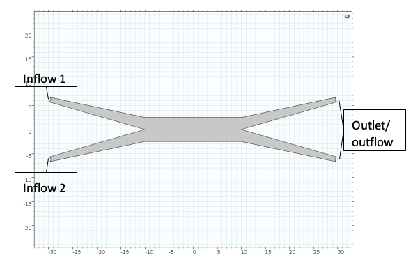 Method 1 – inside COMSOL I. Open your CAD design in Autodesk Inventor II. Move your mouse over the H-channel area. III. Right Click on the channel (make sure the channel gets highlighted excluding the inlets/outlets) IV. On the dropdown menu, select Export Face As… V. The format we need for COMSOL is .dxf – this will produce a 2D sketch of our channels with the micropillars. VI. Run COMSOL VII. Choose Model Wizard under New VIII. Next choose 2D IX. Search and add Laminar Flow (spf) X. Search and add Transport of Diluted Species (tds) XI. Select the Stationary Study XII. Select and Right click on Component 1 > Geometry 1 and select Import XIII. Select the source file type to be DXF and browse for your exported face file without the micropillars XIV. Under Import options dropdown menu, change from “Form Solids” to “Knit curves” XV. Press Build Selected XVI. Select and Right click on Component 1 > Geometry 1 and select Delete Entities XVII. In the Geometry entity level dropdown menu, change from “Object” to “Boundary” unless already so XVIII. Now select on the Graphics all channel boundaries, but none of the micropillars XIX. Build Selected XX. Select and Right click on Component 1 > Geometry 1 and select Import XXI. Select the source file type to be DXF and browse for the same exported face file without the micropillars XXII. Keep the Import options as “Form Solids” and Build Selected XXIII. Select and Right click on Component 1 > Geometry 1 and select Booleans and Partitions > Difference XXIV. Objects to add select the channels |
