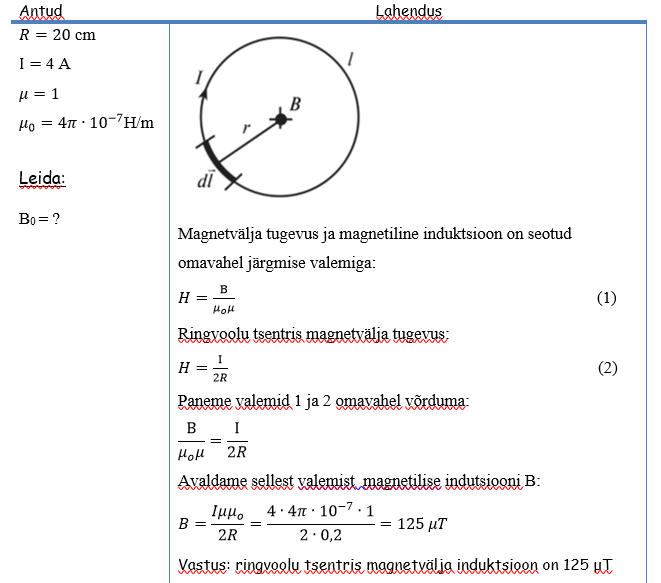 Milline on ringvoolu keskpunktis magnetvälja induktsioon, kui ringvoolu raadius on 20 cm ning juhtmes läbiv vool on 4 A. Juht asub vaakumis.