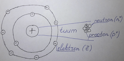 Aatom ehitus. Aatom koosneb tuumast, kus asuvad prootonid ja neutronid. Kuna neutronid ei oma laenguid, siis tuumal on positiivne laeng tänu prootonitele. Tuuma ümber tiirlevad elektronid, mille laeng on positiivne. Aatom on tervikuna neutraalne, kuna positiivsete prootonite arv on võrdne negatiivsete elektroonide arvuga.